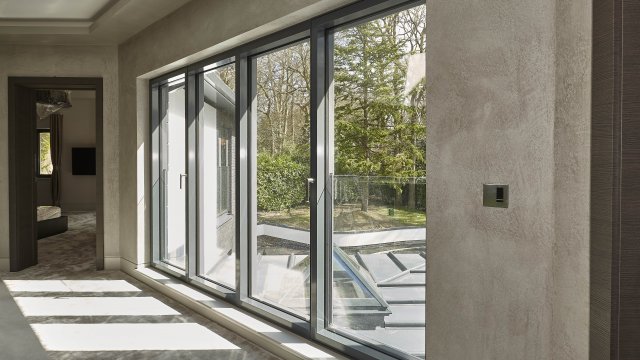 At the heart of the house is a striking galleried hall with a feature staircase, where our minimal-frame Sky-Frame glazing helps draw natural light deep into the interior while framing serene garden views across a reflection pool. Carefully integrated Schüco systems in doors and windows across the home support the interplay of vertical and horizontal lines created by the projecting bay elements—allowing for a subtle yet impactful articulation of the façade.